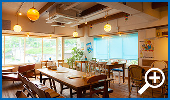 真っ白な壁にカラフルな装飾や家具が楽しい気分にさせてくれます!天気の良い日はパタパタ扉を全開にしてオープンエアーに! |