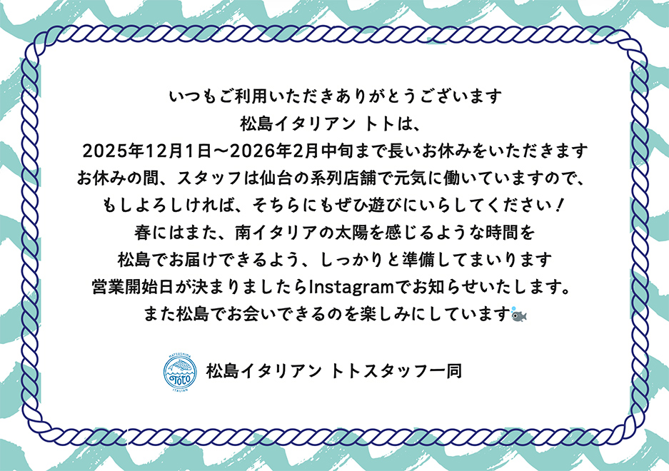松島海岸駅前広場を、映画の舞台となった南イタリアにある小さな村の広場に見立て、トト少年が映画館「CINEMA PARADISO」に想いを馳せたように、松島に来た方々の素敵な思い出に残る、陽気で楽しい夢のある食堂になりたい!との思いを込めています。